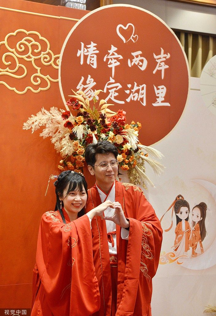 2022年8月4日,厦门,适逢农历七夕节,50对在厦门湖里区生活工作的两岸青年男女,身着汉服一同参加“情牵两岸,缘定湖里”中式传统婚典礼仪,行结婚大礼,见证彼此美好幸福的一刻。每对佳偶中都有一位来自海峡彼岸台湾。来自台湾嘉义的张耿豪与厦门姑娘姚若瑛,2003年第一次相见,是在厦门的公交车上。2006年,上大三的张耿豪,在校园中与她擦肩而过,才知道原来那天公交车上的女孩是他的学姐。经多方打听,在同学的牵线之下,张耿豪终于联系上姚若瑛。后来,张耿豪留在厦门工作,每天接姚若瑛下班,两人过起平凡甜蜜的小日子。图为张耿豪和姚若瑛在2022年湖里区首届“海峡两岸七夕牵手会”活动上拍照留念。 中新社记者 张斌 摄