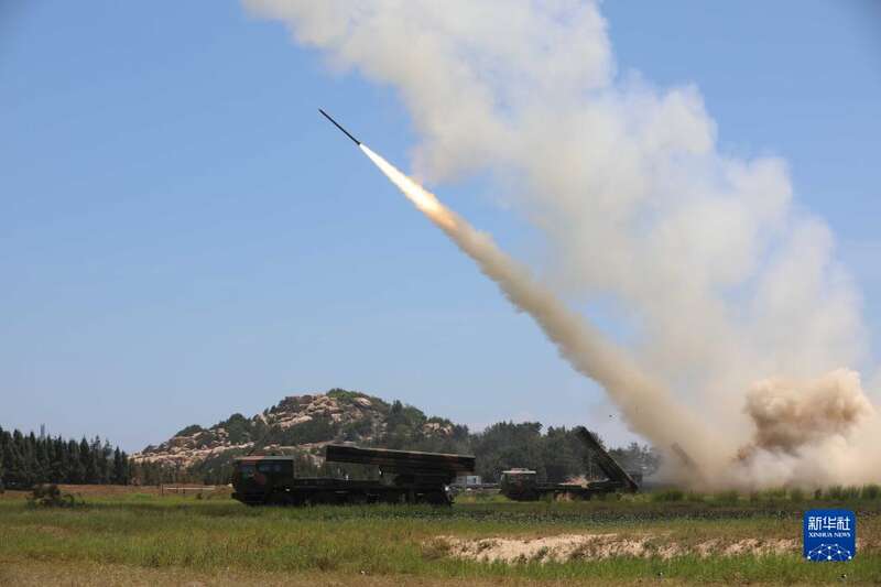 8月4日,东部战区陆军某旅组织远火分队在台湾海峡组织实弹射击,完成精确打击任务。这是发射现场。