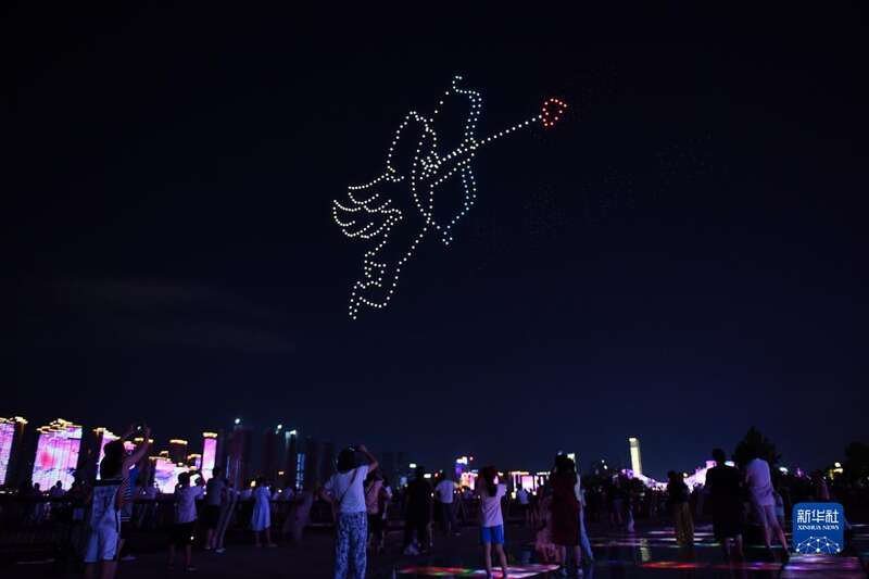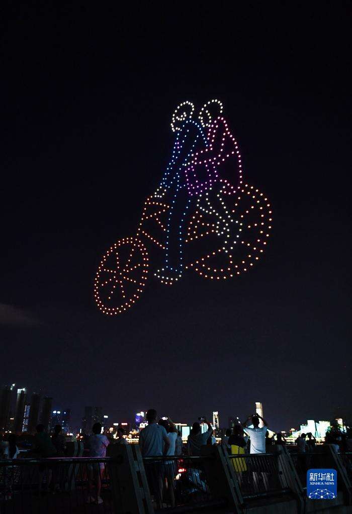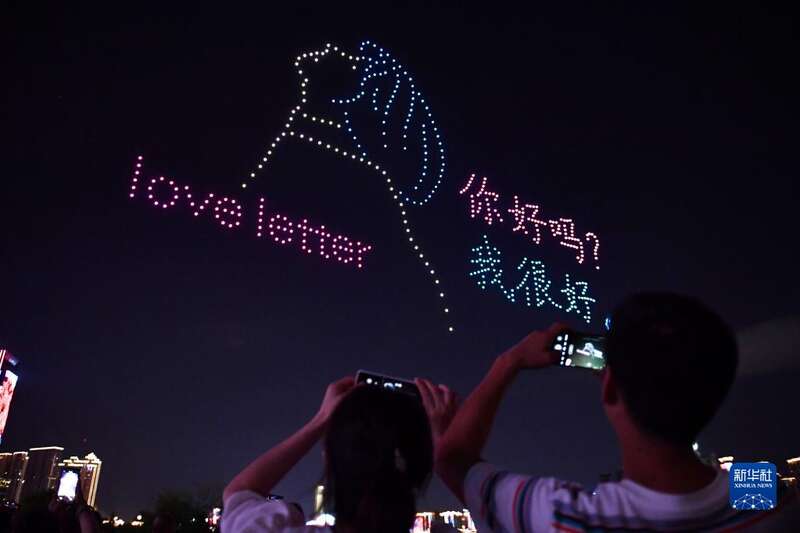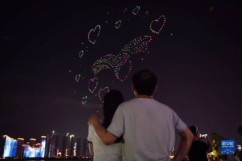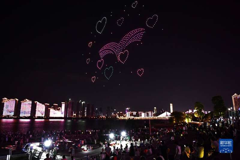 当日是七夕节,一场无人机光影秀在湖南省长沙市湘江畔上演,吸引市民驻足观看。