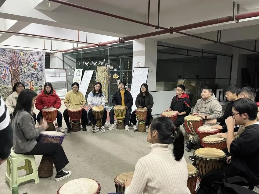 同学们在课堂上学习非洲鼓的演奏