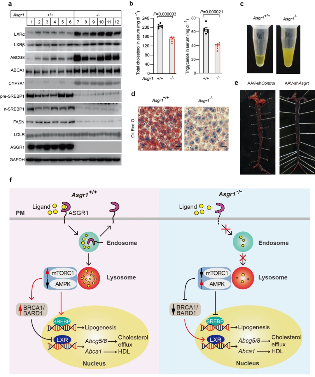 a, 蛋白质免疫印迹分析显示在Asgr1敲除小鼠的肝脏中介导胆固醇外排的蛋白增加。b, Asgr1敲除小鼠的血清中胆固醇和甘油三酯水平显著降低。c, Asgr1敲除小鼠胆汁浑浊,提示胆汁中胆固醇增多。d, Asgr1敲除小鼠的肝脏脂质减少。e, 减少Asgr1表达预防动脉粥样硬化斑块形成。f,ASGR1作用模式图简介。