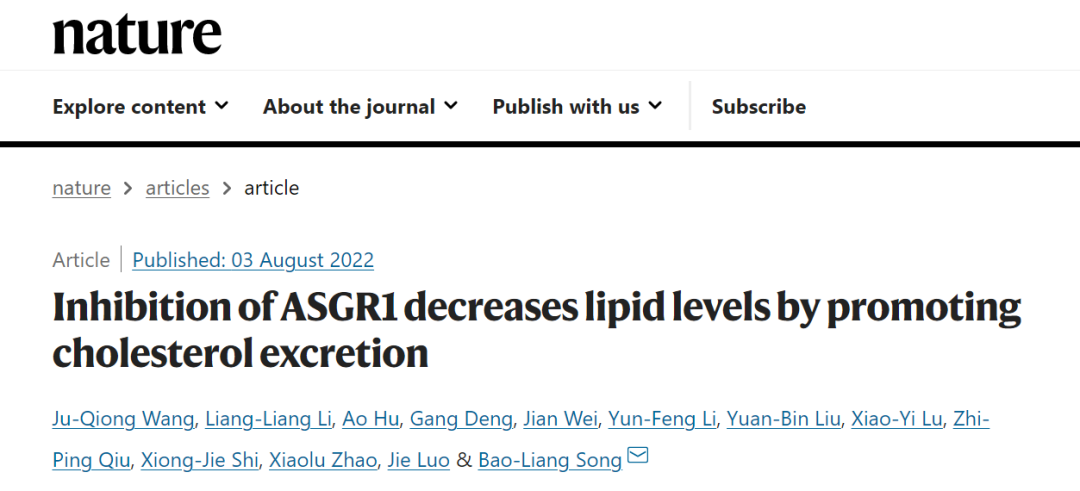 论文题为“Inhibition of ASGR1 decreases lipid levels by promoting cholesterol excretion”(《抑制ASGR1蛋白促使胆固醇外排而降低脂质水平》)。武汉大学生命科学学院博士后王菊琼为论文第一作者,宋保亮为通讯作者。武汉大学生命科学学院硕士李亮亮、博士胡傲、硕士研究生邓港、博士魏健、博士李云峰、博士研究生刘源彬、博士邱智萍、副教授史熊杰、副教授赵晓璐、教授罗婕为共同作者。武汉大学为唯一作者单位。