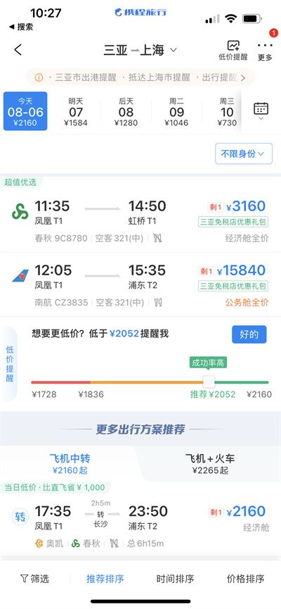 8月6日10点半左右,澎湃新闻查询携程发现,6日三亚直飞上海的航班仅有春秋和南航两班航班,且都只剩一张票,春秋航班仅剩的一张票为经济舱全价3160元,南航为公务舱全价15840元。