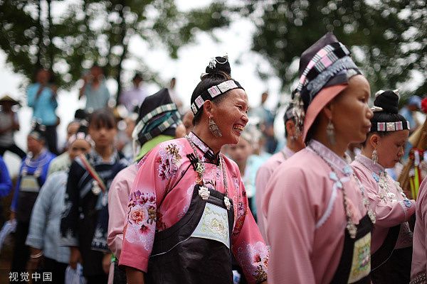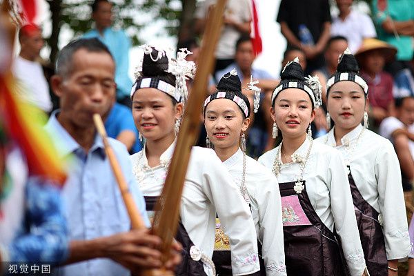 2022年8月5日,贵州黔东南,丹寨县扬武镇排莫村的苗族同胞迎来传统节日“爬坡节”,来自周边村寨的苗族村民盛装打扮,欢聚在山顶上跳传统芦笙舞,欢度节日。