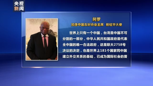 加蓬中国友好协会主席、前驻华大使阿罗表示,世界上只有一个中国,台湾是中国不可分割的一部分,中华人民共和国政府是代表全中国的唯一合法政府,这是联大2758号决议的决定,也是世界上181个国家同中国建立外交关系的基础,已成为国际社会的普遍共识和国际关系基本准则。加中友协坚定支持一个中国原则,坚定支持中方捍卫国家主权和领土完整。