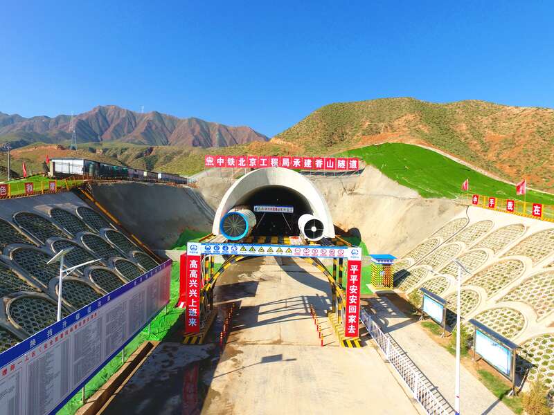 香山隧道位于宁夏回族自治区中卫市沙坡头区,全长17.763公里,横贯香山山脉,是全线控制性工程,由中国铁路兰州局集团有限公司建设管理、中铁第五勘察设计院设计、中铁北京工程局施工。