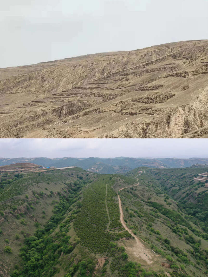 拼版照片:上图为2013年拍摄的甘肃省庆阳市华池县南梁镇高台村荒山景象(资料图片,华池县自然资源局供图);下图为2022年5月25日拍摄的甘肃省庆阳市华池县南梁镇高台村万亩苗林示范点景象(无人机照片,新华社记者 杜哲宇 摄)。新华社发