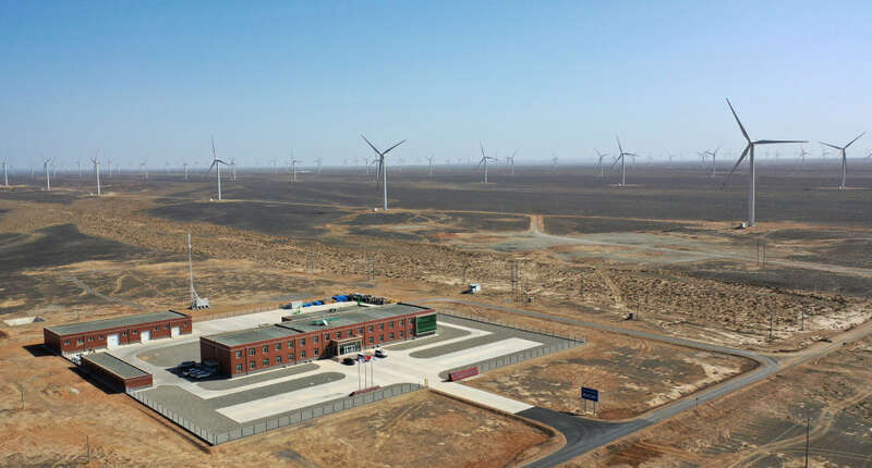 这是2022年4月16日拍摄的甘肃省酒泉市境内的风电基地(无人机照片)。新华社记者 陈斌 摄