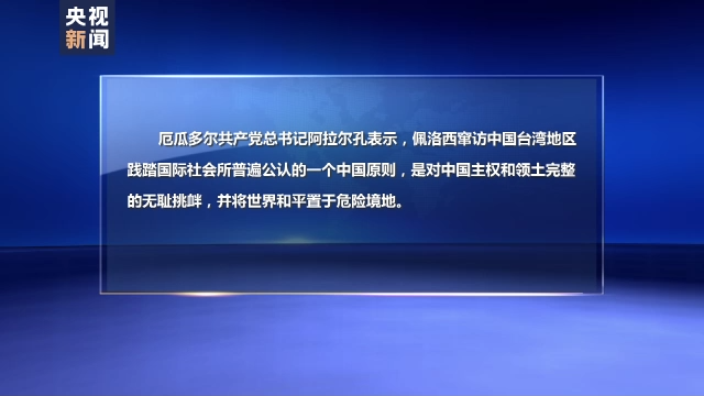 厄瓜多尔共产党总书记阿拉尔孔表示,佩洛西窜访中国台湾地区践踏国际社会所普遍公认的一个中国原则,是对中国主权和领土完整的无耻挑衅,并将世界和平置于危险境地。