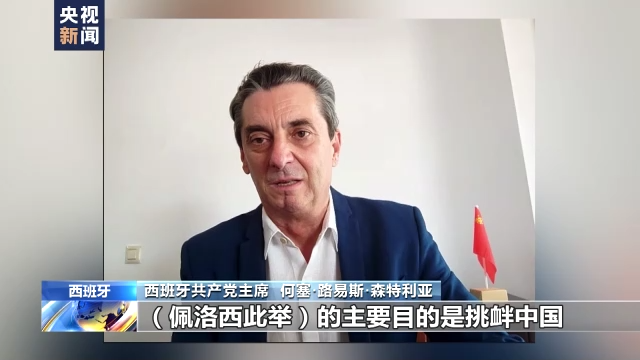 西班牙共产党主席 何塞·路易斯·森特利亚:(佩洛西此举)的主要目的是挑衅中国,这是非常不负责任的行径。这种行为使复杂的国际形势更趋严峻并且干涉了中国内政。台湾是中国的一部分,无论历史、文化还是政治上都是如此,这是国际社会的普遍共识。
