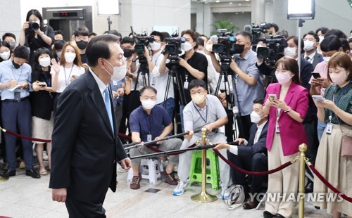 当地时间8月8日上午,在首尔龙山总统府,尹锡悦答记者问后走向办公室。图自韩联社