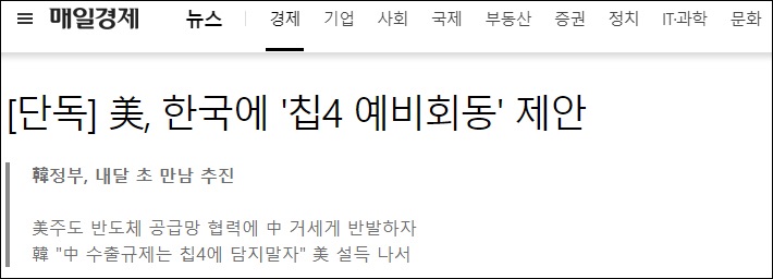 《每日经济》7日报道截图:美国提议“芯片四方联盟”预备会晤,韩国政府计划在下月初举行