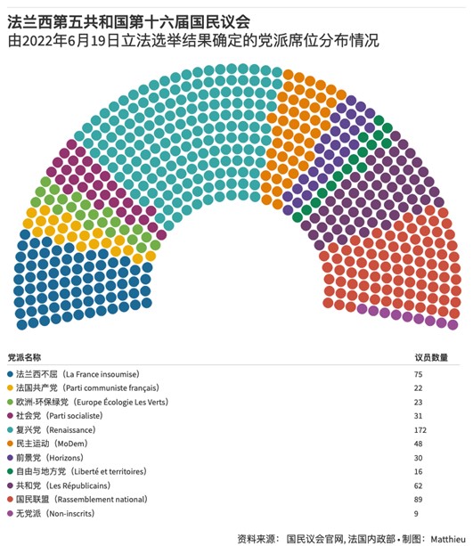 作为马克龙第二任期开始后优先解决的事项,有关疫情防控以及保护购买力法案在议会中的通过过程反映了当前法国议会中的力量对比。马克龙不再拥有议会的绝对多数,尽管大多数政治意图仍能够通过,但反对派力量在议会中得到加强。