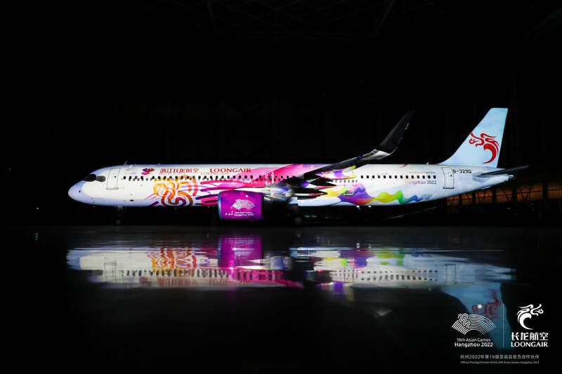 8月8日晚,长龙航空“亚运号”火炬主题彩绘飞机正式亮相。 杭州亚组委供图