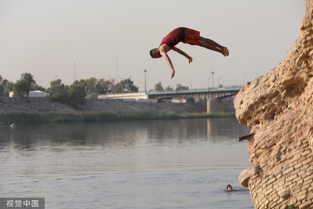 当地时间2022年8月4日,伊拉克巴格达,天气炎热,人们跳入底格里斯河降温。视觉中国 图
