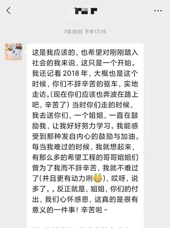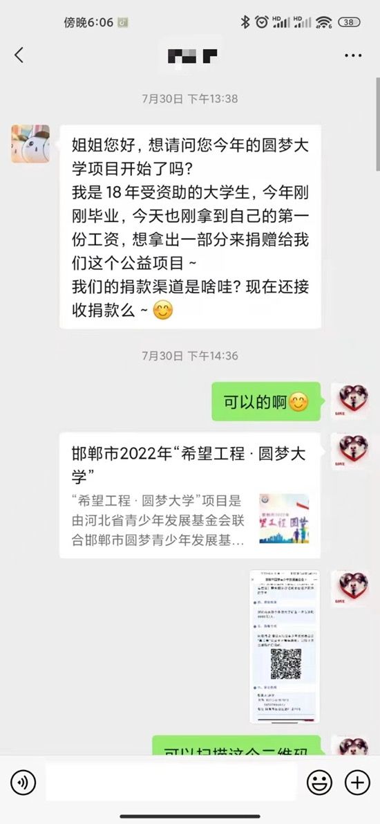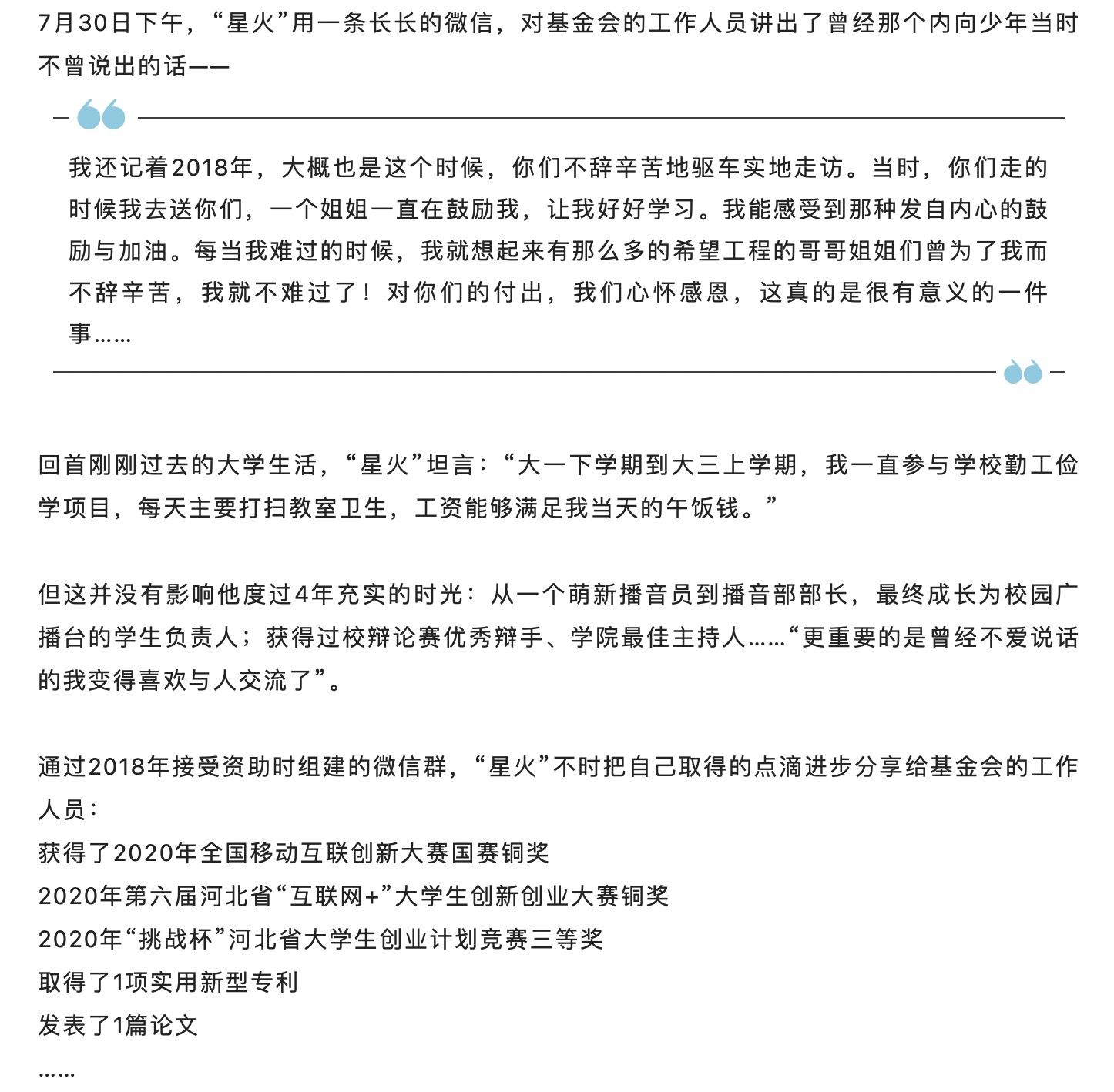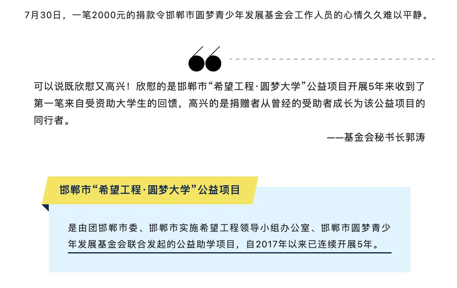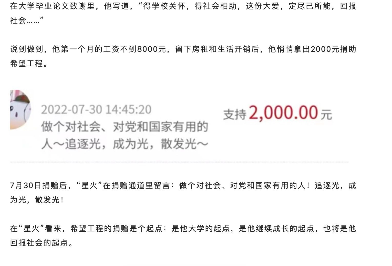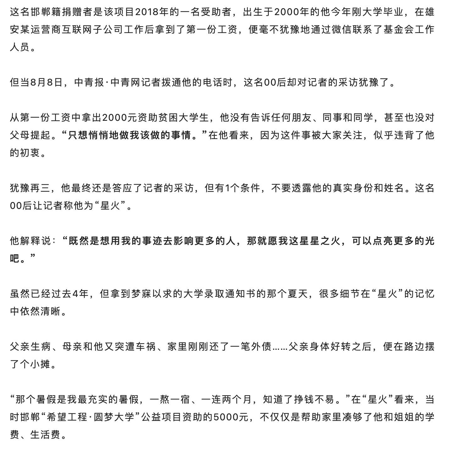 00后小伙“星火”曾是邯郸市“希望工程·圆梦大学”公益项目受助者,今年毕业的他在拿到第一份工资后,便拿出2000元捐赠资助贫困大学生,从受助者变捐赠者、同行者……