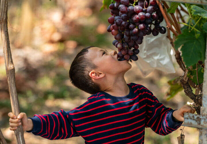 小朋友在东风农场的葡萄架下吃葡萄(8月8日摄)。
