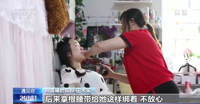 向晨曦的妈妈 田水英:我就担心她身体,我说你不要上了。她说不上不行,不上我的手脚就不行了。后来拿根腰带给她这样绑着,不放心,有一次绑住了,倒在地上,头破了,(破了)这么长一个口子,缝针了,更加不放心了。我说我就一天都陪着你,我哪里也不去了,我就陪着你。