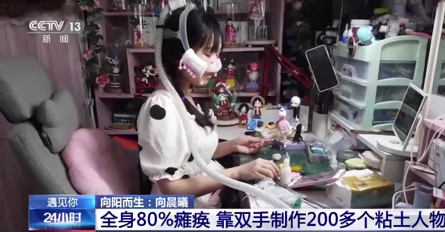 为了照顾患病的女儿,四年前,晨曦的妈妈辞职回家,几乎寸步不离伴她左右,给予她生活上的一切照顾。有了妈妈的支持和鼓励,晨曦努力生活,虽然收入不稳定,但她并没有放弃。2016年,晨曦受到一位聋哑姑娘的启发,在做网店客服之余,开始尝试做起了直播。网络直播这种新颖的互动方式,为她打开了一个全新的世界。在此期间,她还接触到了粘土,从此找到了自己擅长并喜爱的事情,在全身80%瘫痪的情况下,仅靠双手就制作了200多个粘土人物。