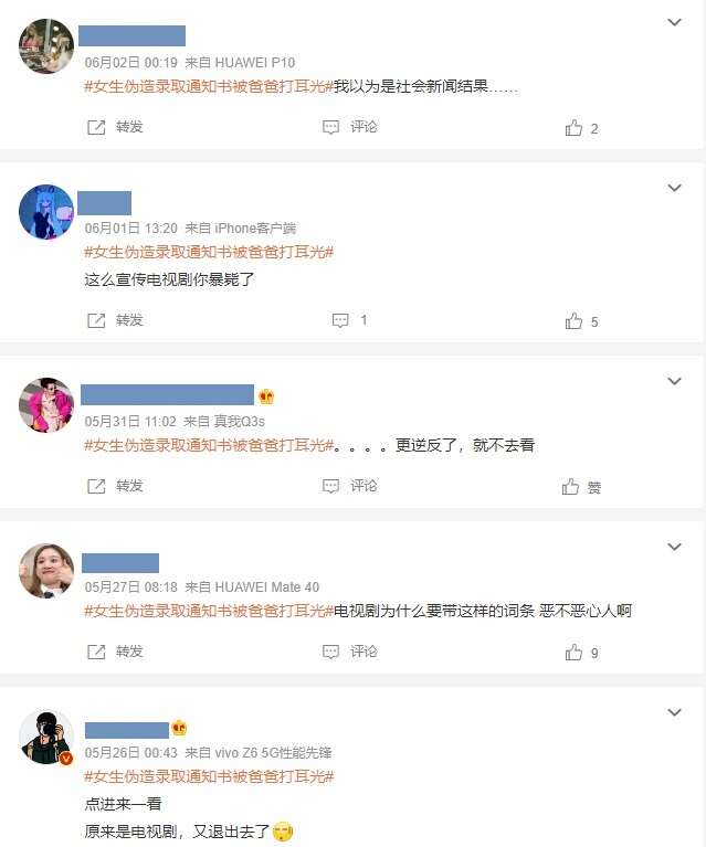 今年5月,一条“女生伪造录取通知书被爸爸打耳光”的话题曾登上热搜,因涉及教育和家暴这样敏感的话题,引起不少网友关注,点开才发现是网剧《法医秦明之读心者》的剧情。这样的话题让不少网友炸锅,批评这样的做法“无下限”。