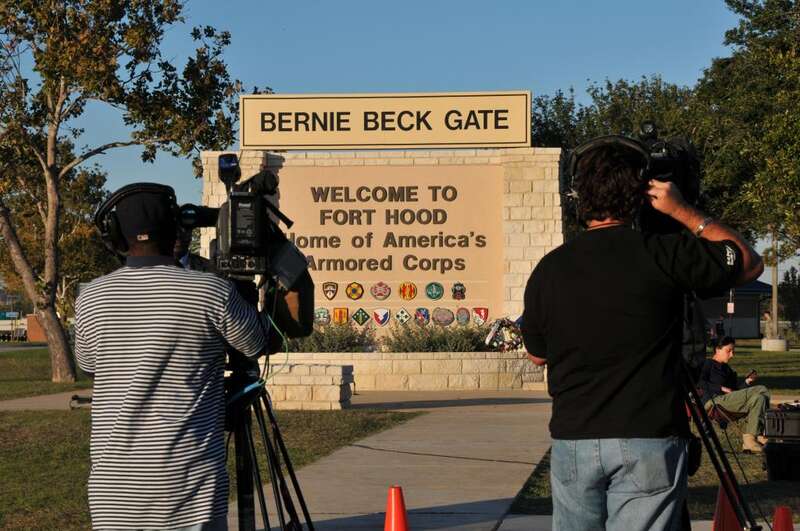 图为2009年11月6日拍摄的美国得克萨斯州胡德堡军事基地的资料照片。当时两名摄像记者在基地大门前拍摄。新华社记者陈如为摄