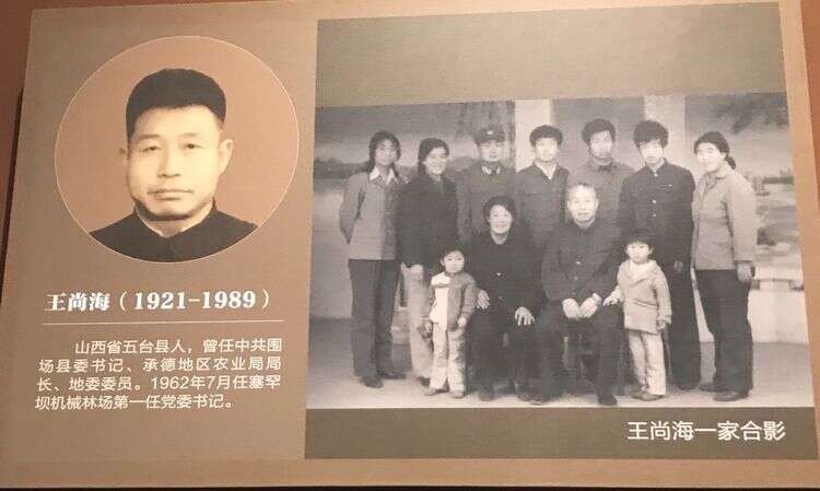 王尚海,塞罕坝机械林场第一任党委书记,1962年只身来到塞罕坝,而后又把妻子和5个孩子从承德市带到了这里。他带领职工们克服困难,13年造林植绿54万亩。1989年12月24日,遵从老书记王尚海的遗愿,人们把他的骨灰撒在了马蹄坑林区。如今,"王尚海纪念林"已经成为塞罕坝人永久的精神家园。