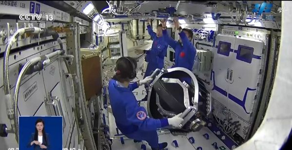 问天舱为更多学科的空间科学实验提供了全新环境、全新内容、全新角度。这组画面是神舟十四号航天员在进行问天舱平台仪器区解锁、科学实验机柜解锁等工作,航天员陈冬和蔡旭哲取出平台设备并进行安装。完成基础的舱内设置工作后,航天员随即开展在轨科学实验,在蔡旭哲的配合下,陈冬开始解锁生命生态实验柜,随后,蔡旭哲打开通用生物培养模块,三名航天员开始配合完成模块解锁、安装与基础功能测试工作。