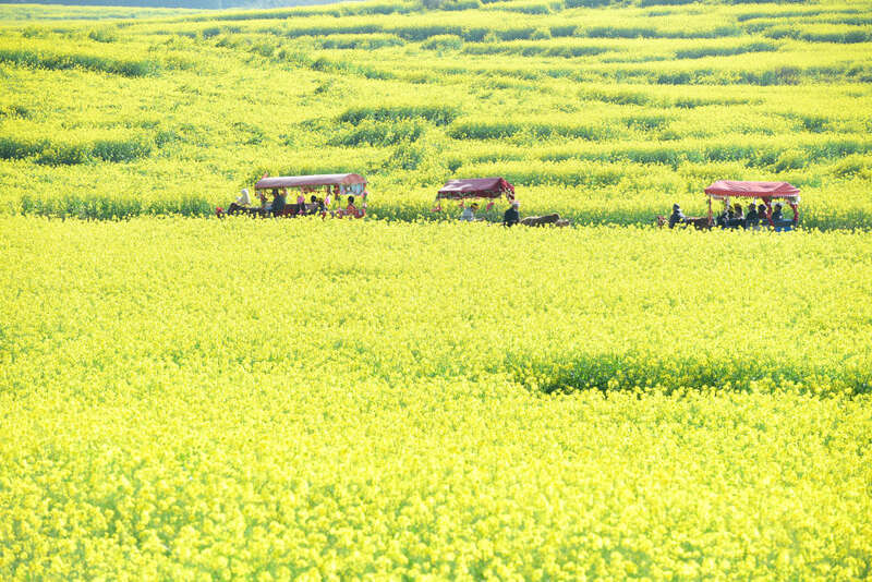 游客乘牛车在云南省曲靖市罗平县的油菜花田中游玩(2022年2月28日摄)。新华社发(毛虹摄)