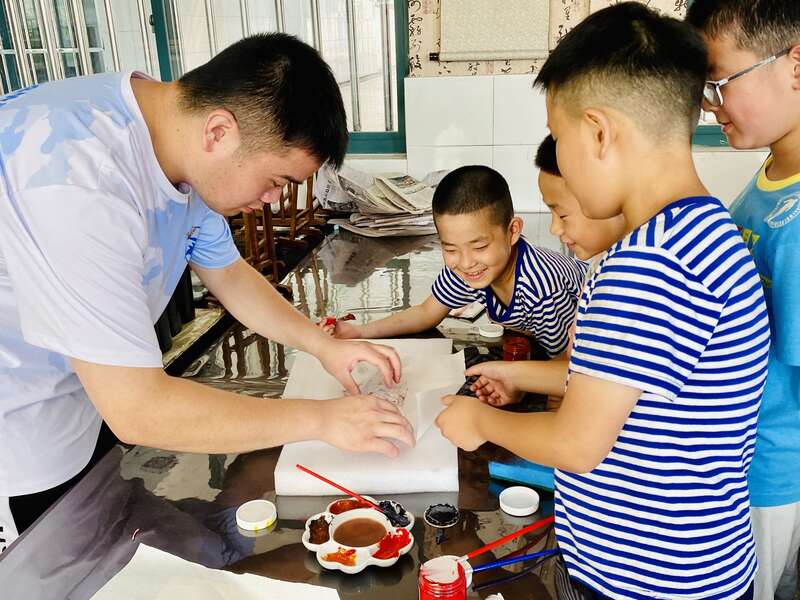 实践队员教授小学生鱼拓制作。浙江万里学院供图
