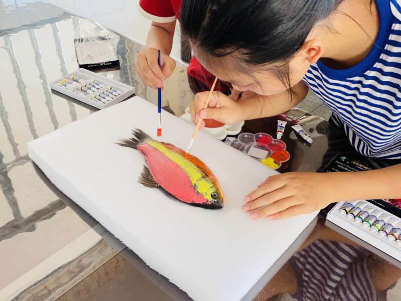 小学生尝试鱼拓制作。浙江万里学院供图