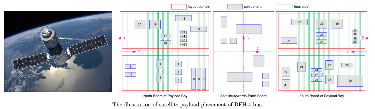 本届大会于3月1日面向全球进化计算和计算智能领域的研究人员,发布了10项极具挑战性的竞赛。其中,“单目标约束优化”赛事以东方红四号卫星受限板载空间中电子元器件的热布局优化难题作为研究背景,提出一种受热管约束的部件布局优化问题(Heat Pipe-Constrained Component Layout Optimization),旨在保障电子设备在太空极端条件下运行的可靠性并优化其性能指标。