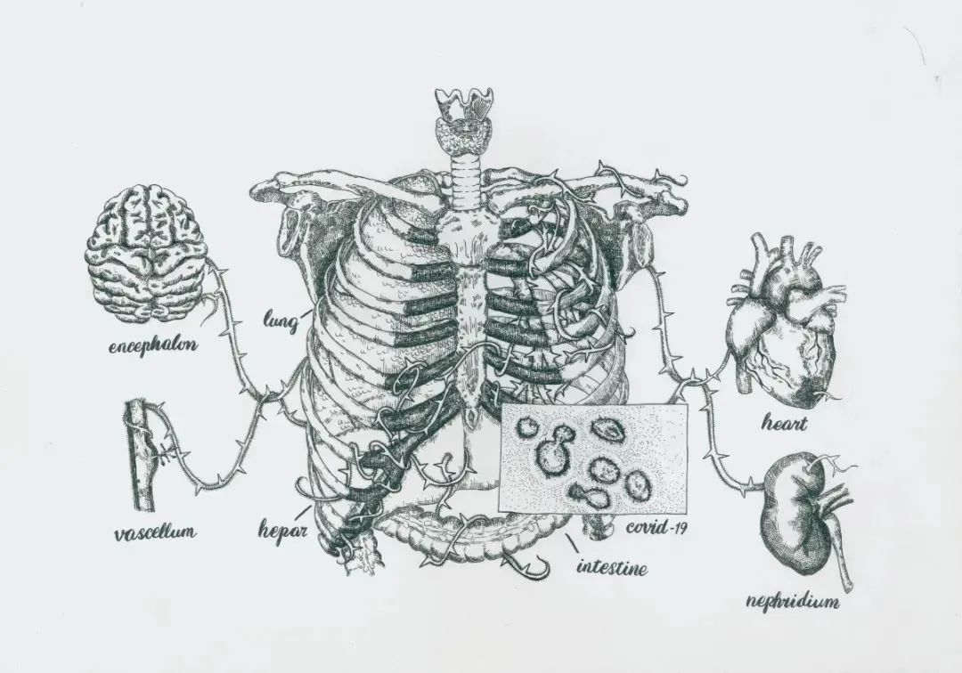 作品简介:距离新冠疫情爆发已一年有余,相关科研成果迅速跟进。目前已知新冠病毒可影响全身各大器官,除肺外,还包括脑、心、肾、肝、肠、血管等,为临床治疗提供了新情报。画面中右下侧为新冠病毒电镜图,病毒如藤蔓荆棘,由肺蔓延向其他器官。采取黑白简单两色,凸显新冠局势的严峻与无情。