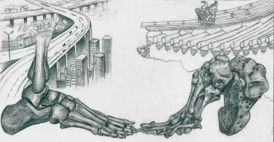 作品简介:作品造型来源于学校形态学馆内的“三寸金莲”标本,以素描的形式来完成:一边是绚丽的现代都市,正常的足骨可以在公路、高楼甚至是远方的山水之间自由穿行;一边是古代楼阁,畸形的足骨只能禁锢于一隅屋檐下。“三寸金莲”不仅禁锢了古代女性的身体,也给她们的心灵留下严重创伤。