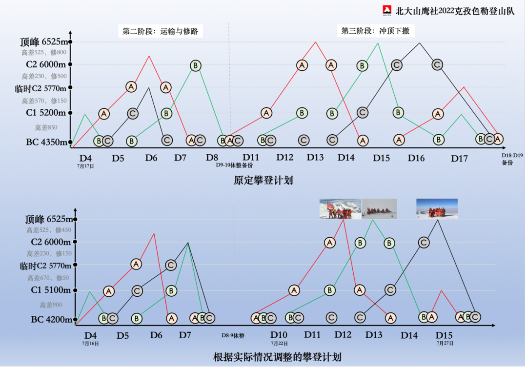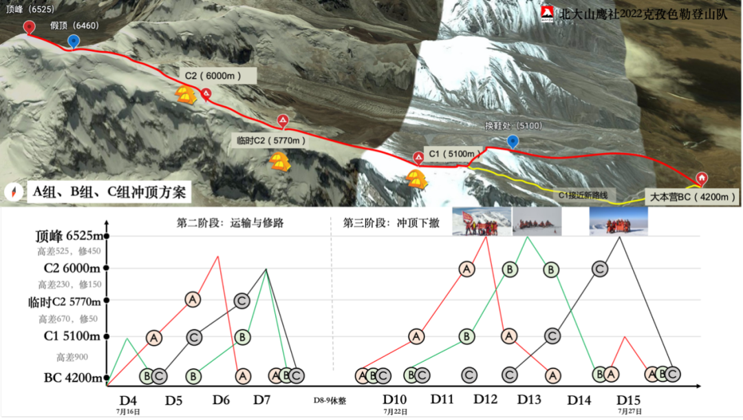 此次登山属于大规模喜马拉雅式自主攀登,有大量的营地建设和修路等任务。登山队将克孜色勒高山营地设置为大本营BC、C1、C2三个正式营地和一个临时C2营地,将整个攀登阶段分为进山与适应、运输与修路、冲顶下撤三个阶段。其中后两个阶段由于任务复杂繁重,采用分组分工合作的形式。综合人员规模和队员适应情况分为了A、B、C三个组。第二阶段里,三组背负的重量不太一样,在山上待的时间也有所不同。A组同时肩负修路的任务,B、C组任务则是运输下一阶段需要用到的物资。