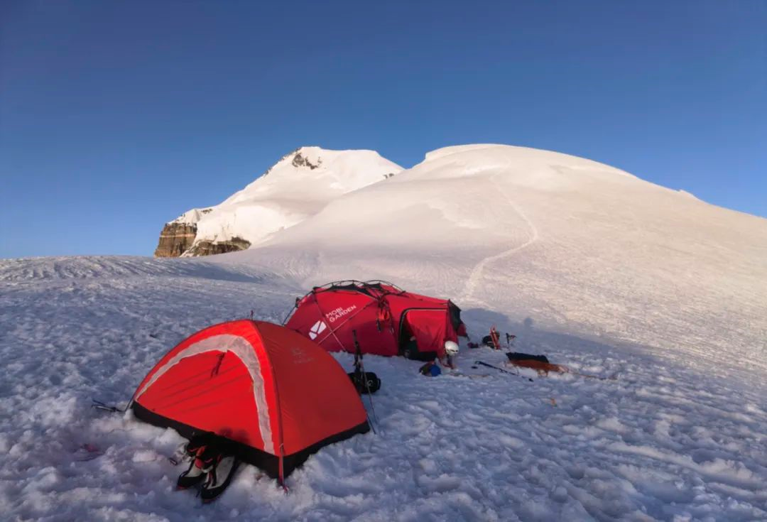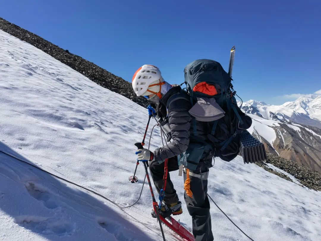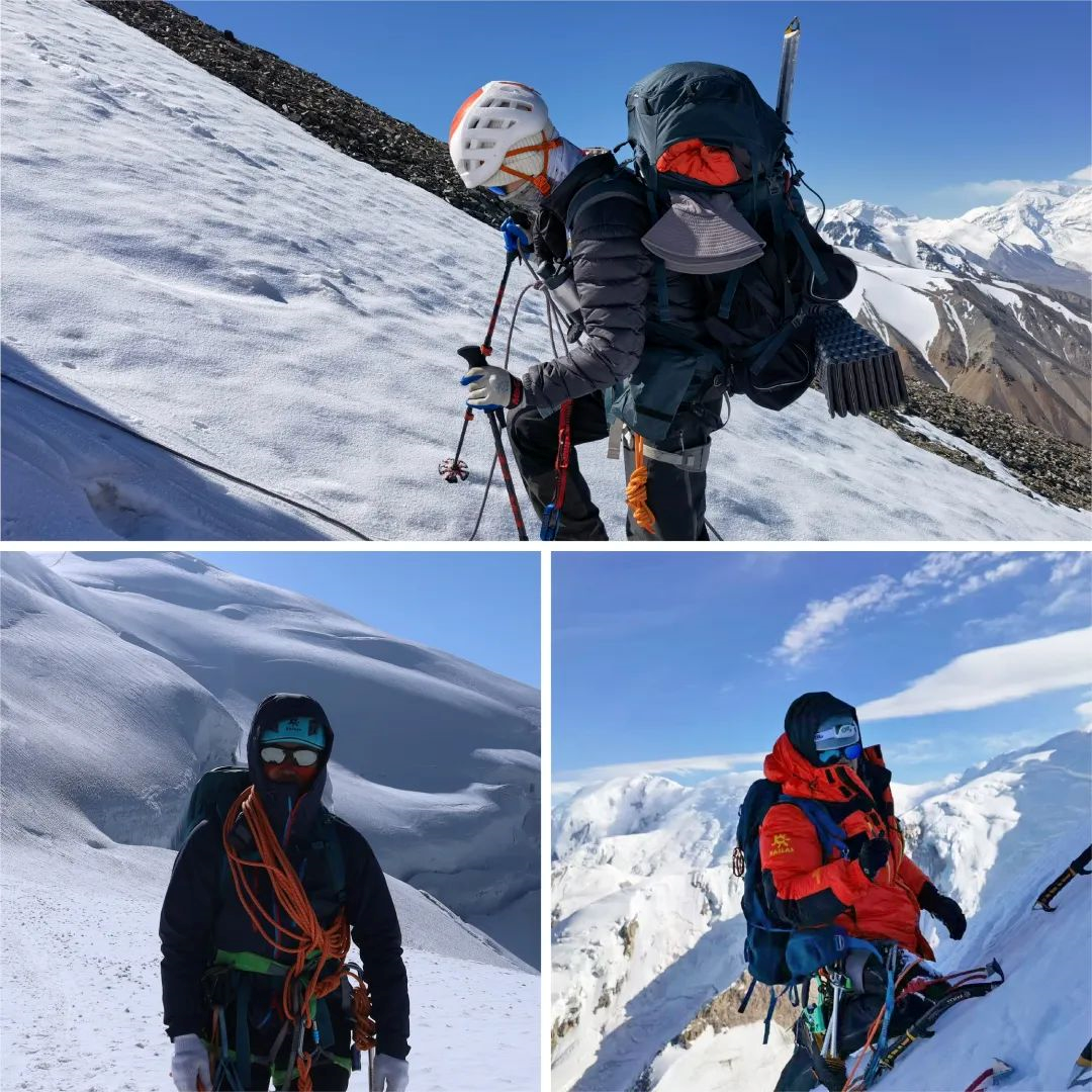 为了解决曾经的难题,登山队做了相应的准备,特地联系了踏雪板的赞助。但意料之外的是A组冲顶异常顺利,只有几十米的路段使用到了踏雪板,资料记载的裂缝区、雪桥等实际情况比队伍预想的好得多。A组在冲顶下撤后和B、C组交换了信息,决定把踏雪板全部背下山,尽可能减轻之后的撤营撤绳任务。在团队共同合作下,最终完成了登顶的任务。