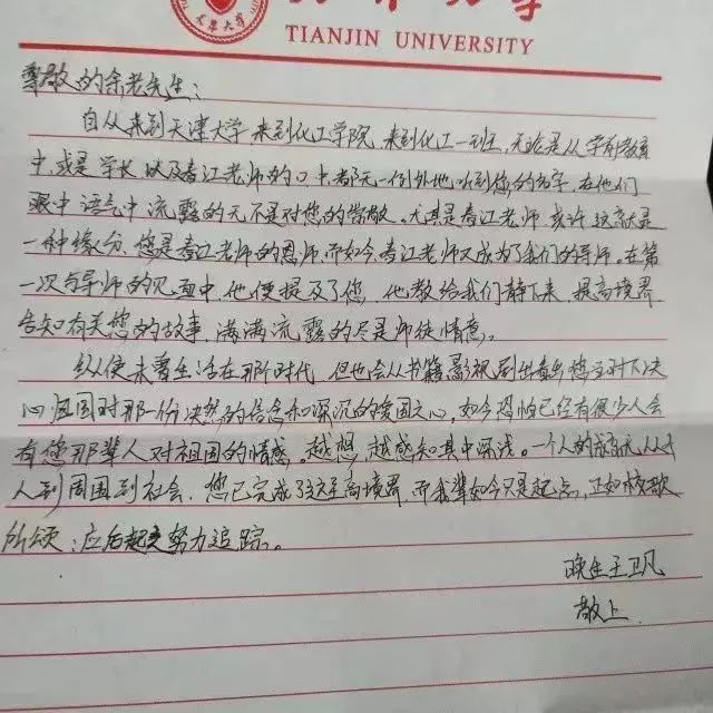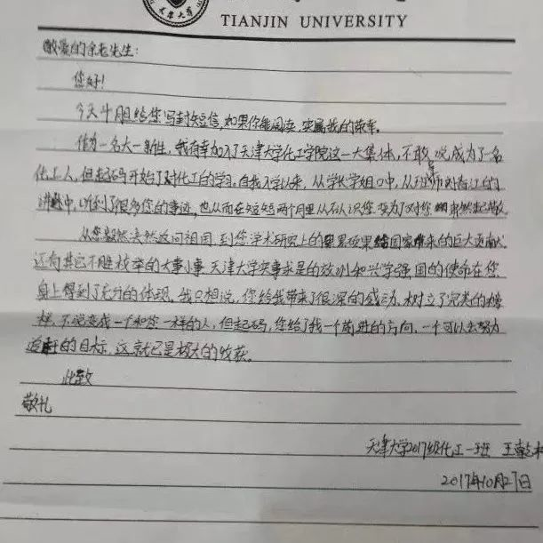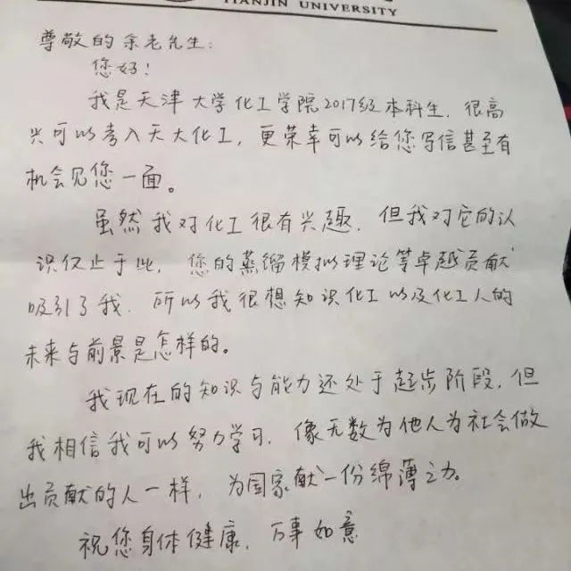 他们在信里写到,“从您毅然决然返回祖国,到您学术研究上的累累硕果,天津大学实事求是的校训和兴学强国的使命在您身上得到充分的体现......”“虽然我对化工很有兴趣,但我对它的认识仅止于此,我很想知道关于化工及化工人的未来和前景是怎样的......”
