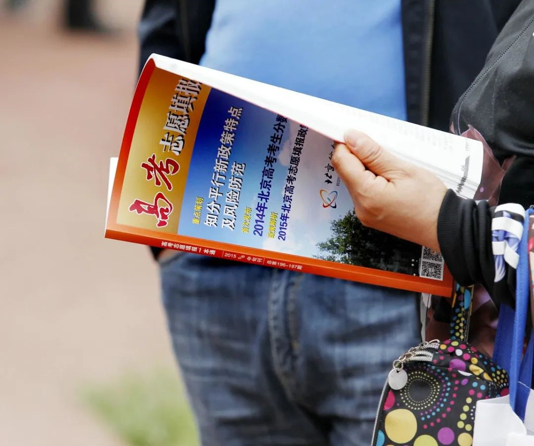 ▲2015年5月9日,北京,高考前最大规模的高招咨询会上,家长手中拿着购买的高考报志愿的资料。(视觉中国 / 图)