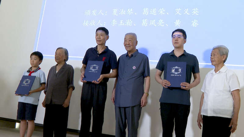 8月15日,南京大屠杀幸存者代表向“南京大屠杀历史记忆传承人”颁发证书。新华社记者刘宇轩摄