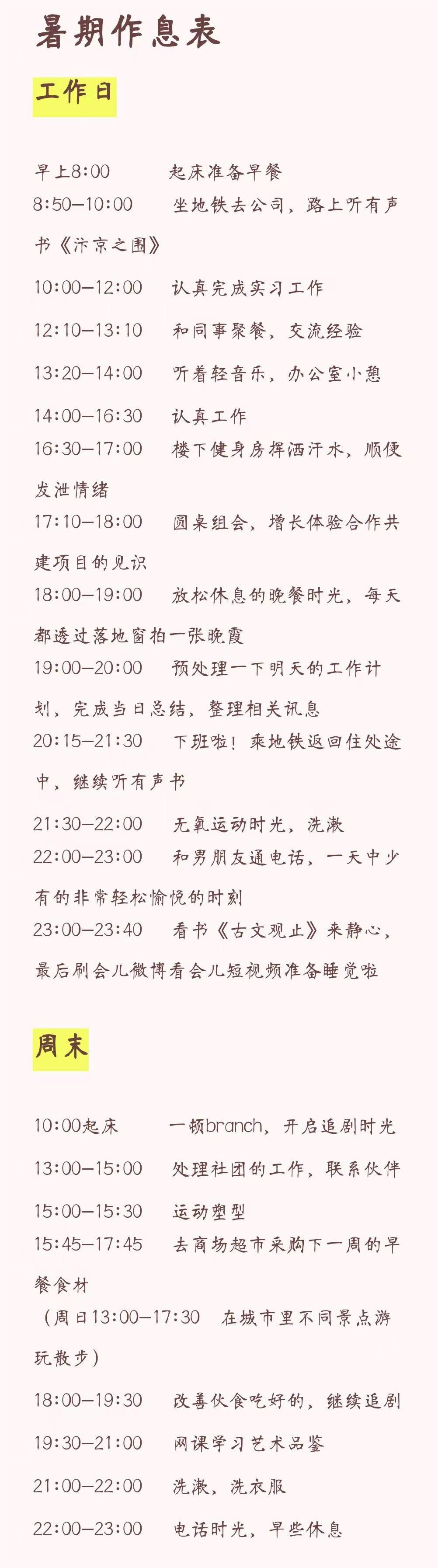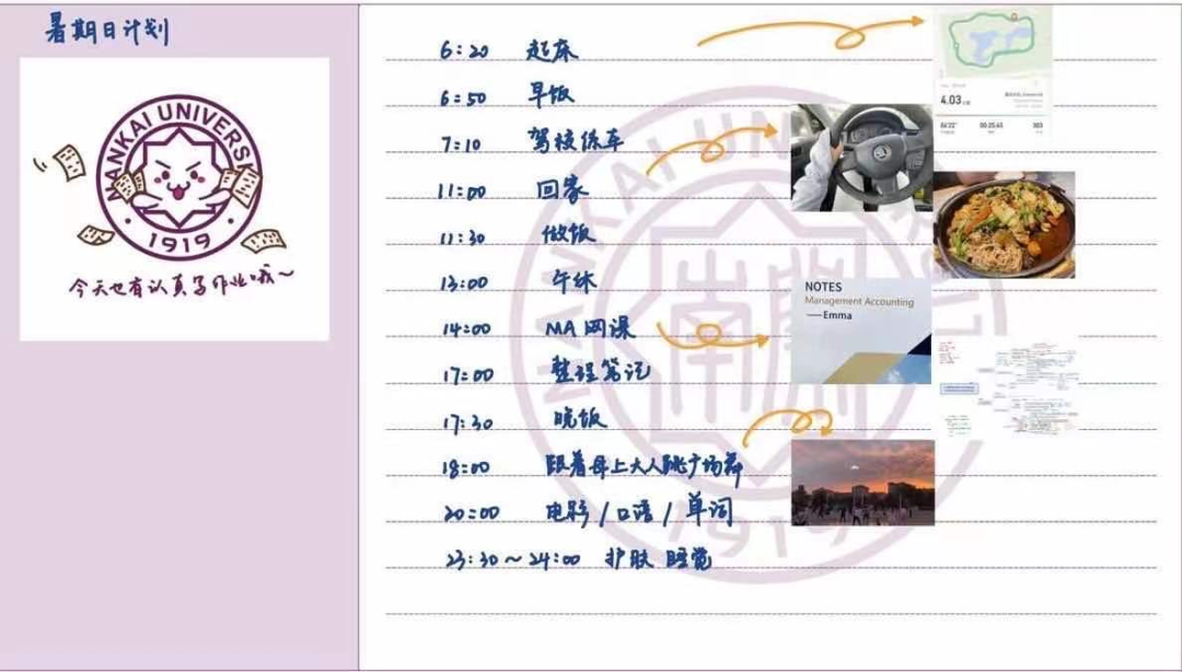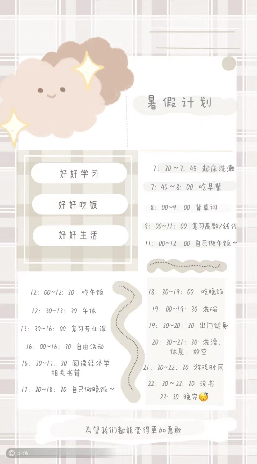 “由于疫情的影响,我们春季学期的考试推迟了。在这样一段特殊的假期里,制定一些日程计划利于缓解备考焦虑,也十分利于实现劳逸结合,度过一个充实美好的假期。”