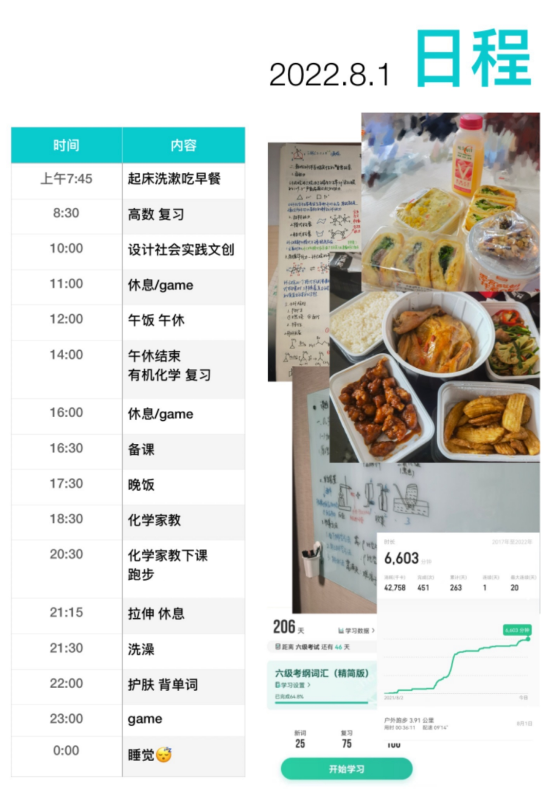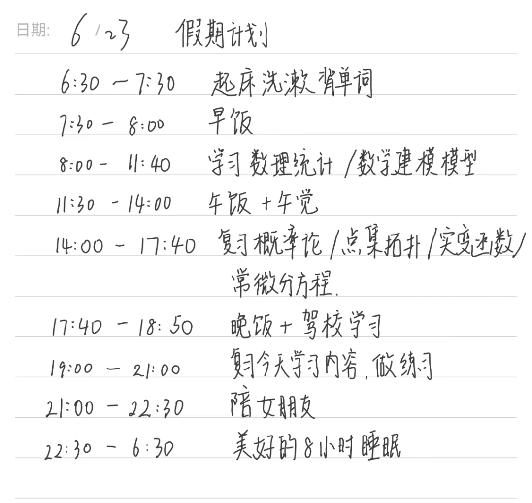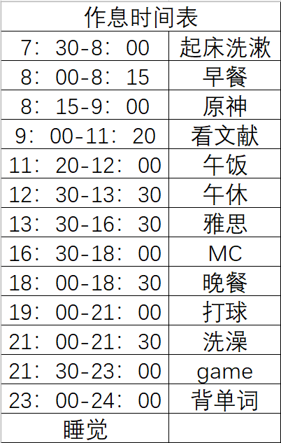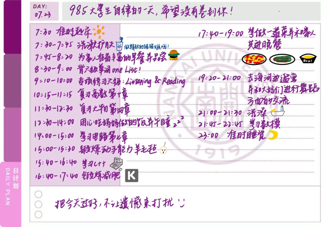“由于疫情的影响,我们春季学期的考试推迟了。在这样一段特殊的假期里,制定一些日程计划利于缓解备考焦虑,也十分利于实现劳逸结合,度过一个充实美好的假期。”