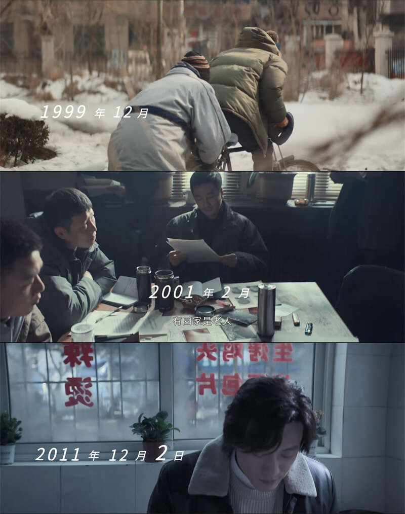 《胆小鬼》不仅保留了小说的双线叙事,呈现上则是三线叙事,1999-2000年、2001年、2011年等几个主要时间段反复切换。小说因为信息量高,读者的阅读时间很浓缩,叙事上可以有更多的花样与玩法,读者并不会因此觉得晦涩;可对于剧集来说,画面的信息量是给定的,观众很难脑补出画面以外的信息,情节往往容易显得孤立单一,过多的时间线索极易让观众产生混乱感。