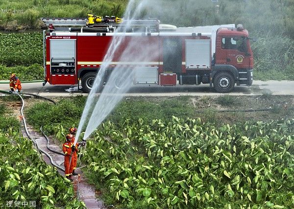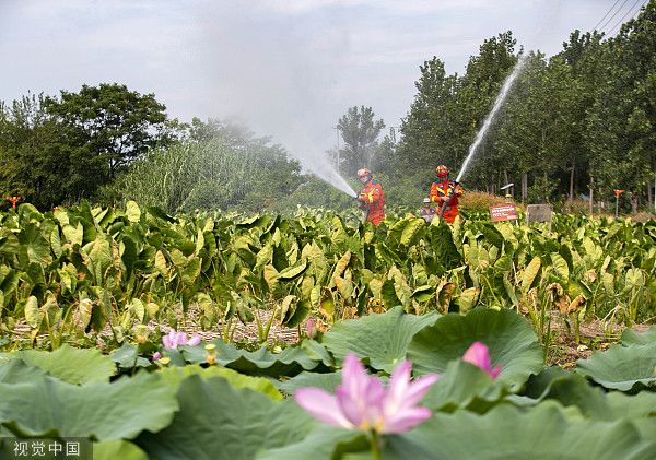 2022年8月15日,江苏泰州,消防人员在兴化市垛田街道高家荡村帮助村民给龙香芋浇水。