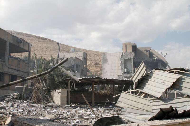 这是2018年4月14日在叙利亚大马士革东北部拜尔宰地区拍摄的遭袭的科学研究中心。当天凌晨,叙利亚境内政府和军方多处目标突遭美国、英国和法国三国联合空袭。(新华社发,梅马里 摄)