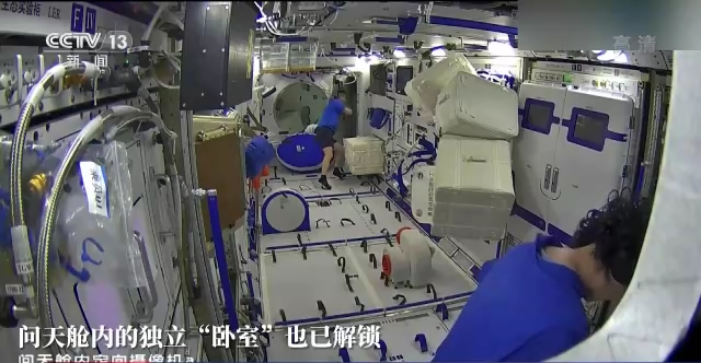 此外,问天实验舱内的独立“卧室”也已经解锁,画面远处,蔡旭哲打开的就是其中一个睡眠区。问天舱配备三个睡眠区,加上原有的核心舱三个睡眠区,中国空间站可支持六名航天员短期在轨驻留,问天实验舱与天和核心舱睡眠区相互备份,保证中国空间站长期稳定运行。