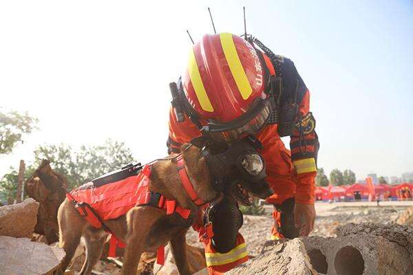 消防救援人员带领搜救犬参与救援演练。中国救援山东搜救犬机动专业支队供图
