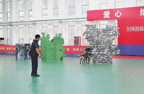 搜救犬在消防救援人员的引导下开展废墟搜救演练。中国救援山东搜救犬机动专业支队供图