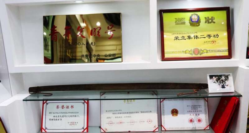 走进泰山消防救援站的荣誉室,里面陈列着127面锦旗,讲述着消防站每一次难忘的救援经历,有翻越过11座大山的千里寻踪,有往返于数万级石阶的一夜无眠,有临危受命阻截山火的反复鏖战……其间,有一根暗红色的旧扁担与崭新的荣誉证书和奖杯牌匾摆在一起,特别引人注目。