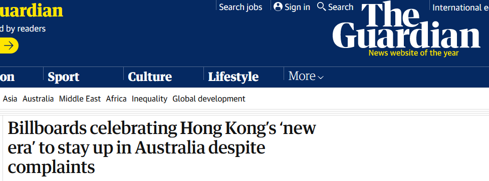 综合英国卫报、澳大利亚SBS广播公司、美国ABC广播公司等外媒信息,在澳“港独”组织“澳港联”及“澳洲维港”给这些广告牌扣上“莫须有”的罪名,声称广告内容违反澳大利亚国家广告协会道德行为守则。
