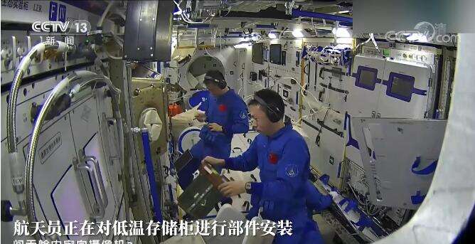 在科学手套箱机柜下方是低温存储装置。这个画面下方,蔡旭哲正在解锁安装的就是低温存储装置。这个装置相当于一个冰箱,它可以提供零上4℃、零下20℃、零下80℃的低温存储能力,满足不同样品所需要的不同低温存储条件。蔡旭哲拿出低温存储柜的部件安装到存储柜中,之后,航天员还开展了对低温存储柜基础功能的测试。