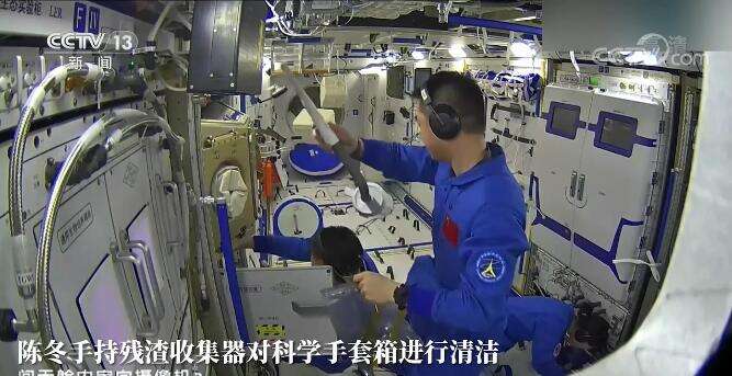 视频中,指令长陈冬手里拿的是残渣收集器,他对科学手套箱进行了认真的清洁,然后进行解锁。陈冬拉出科学手套箱,撕下了一些初始状态的包装。刘洋也打开科学手套箱的手套口,去掉了内部包装。